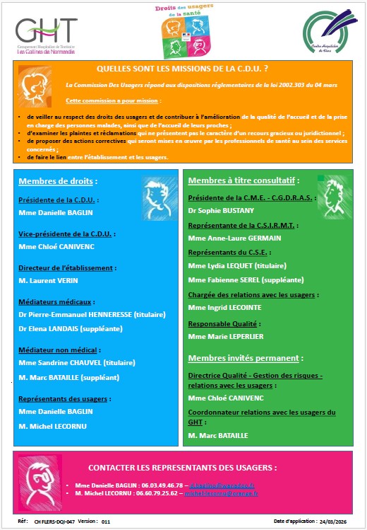La commission des usagers (CDU) : La CDU a pour mission de veiller au respect des droits des usagers et de contribuer à l’amélioration de la qualité de l’accueil des personnes malades et de leurs proches et de la prise en charge.